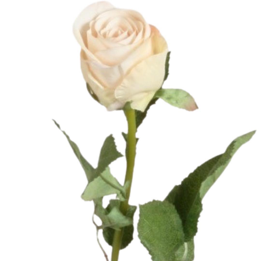 Vacker och fyllig konstgjord och mycket naturtrogen Cream färgad ros. Denna ros har en totalt höjd 75 cm. Det innebär att rosen behöver placeras i högre vas. Denna naturtrogna ros räcker länge. Rosen är den blomman som de flesta säkert har som sin favoritblomma. En blomma vi alla älskar. Ett fång med rosor blir vi väl alla glada över att få. Bladen och blommorna är tillverkade i tyg. Bladen är UV-beständiga. Detta innebär att bladen kan stå emot solens UV-strålning under en längre tid och därmed håller färgen bättre än andra produkter. De tål även vatten, det innebär att du kan ha blommorna stående i vatten för mer äkthets känsla.