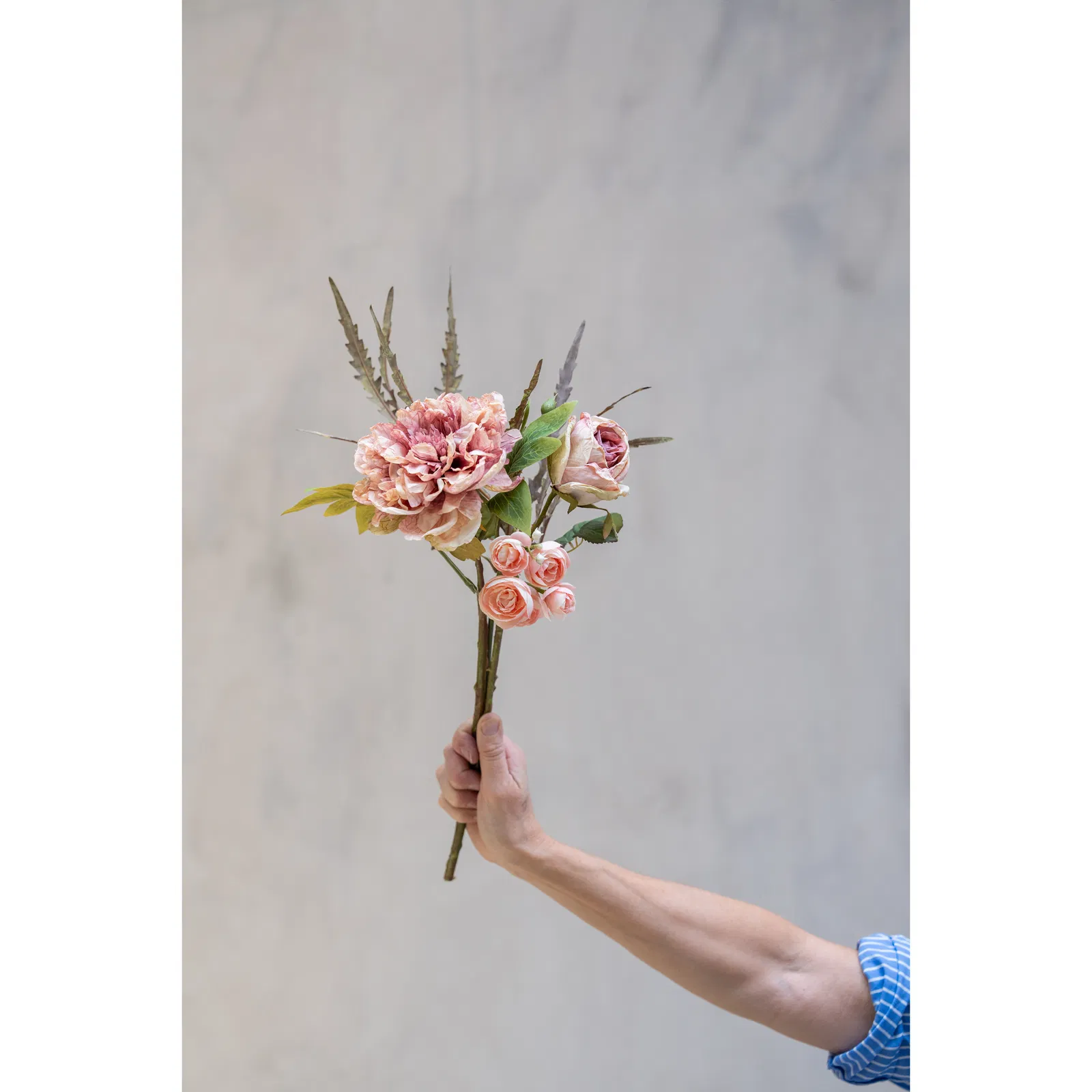 Vacker elegant ljusrosa ros. Kronbladen är i en mjuk, blekrosa nyans med subtila inslag av krämvitt, vilket ger ett realistiskt och romantiskt utseende. De yttre kanterna är något mörkare, vilket förstärker djupet och dimensionen. Kronbladen är noggrant arrangerade för att efterlikna en nyutslagen ros, med en fyllig och rund form som ser både delikat och inbjudande ut. Stjälken är smal och grön, med en naturlig böj som ger intrycket av liv och rörelse. Små, diskreta taggar längs stjälken bidrar till dess autentiska utseende. Bladen är mörkgröna med en lätt glans, vilket fångar ljuset på ett subtilt sätt. De har en tydlig ådring som ger ytterligare realism. De är ovala och något spetsiga, placerade strategiskt längs stjälken för att balansera blomman. Denna konstgjorda ros kombinerar precision och konstnärlighet, vilket gör den till ett perfekt val för dekorationer som vill fånga naturens skönhet utan att vissna. Storlek: 44cm