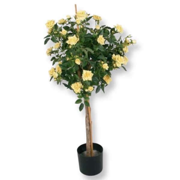 Högklassigt och konstgjort rosträd. Snyggt och somrig och så där underbar och naturtrogen rosbuske i bollform med gula små utslagna rosor. Denna vackra blommande rosboll har riktig trädstam. Bladen och blommorna är tillverkade i tyg. Bladen är UV-beständiga. Detta innebär att bladen kan stå emot solens UV-strålning under en längre tid och därmed håller färgen bättre än andra produkter. De tål även vatten. Plasten, som används bland annat till grenar, är återvunnen LDPE-plast.