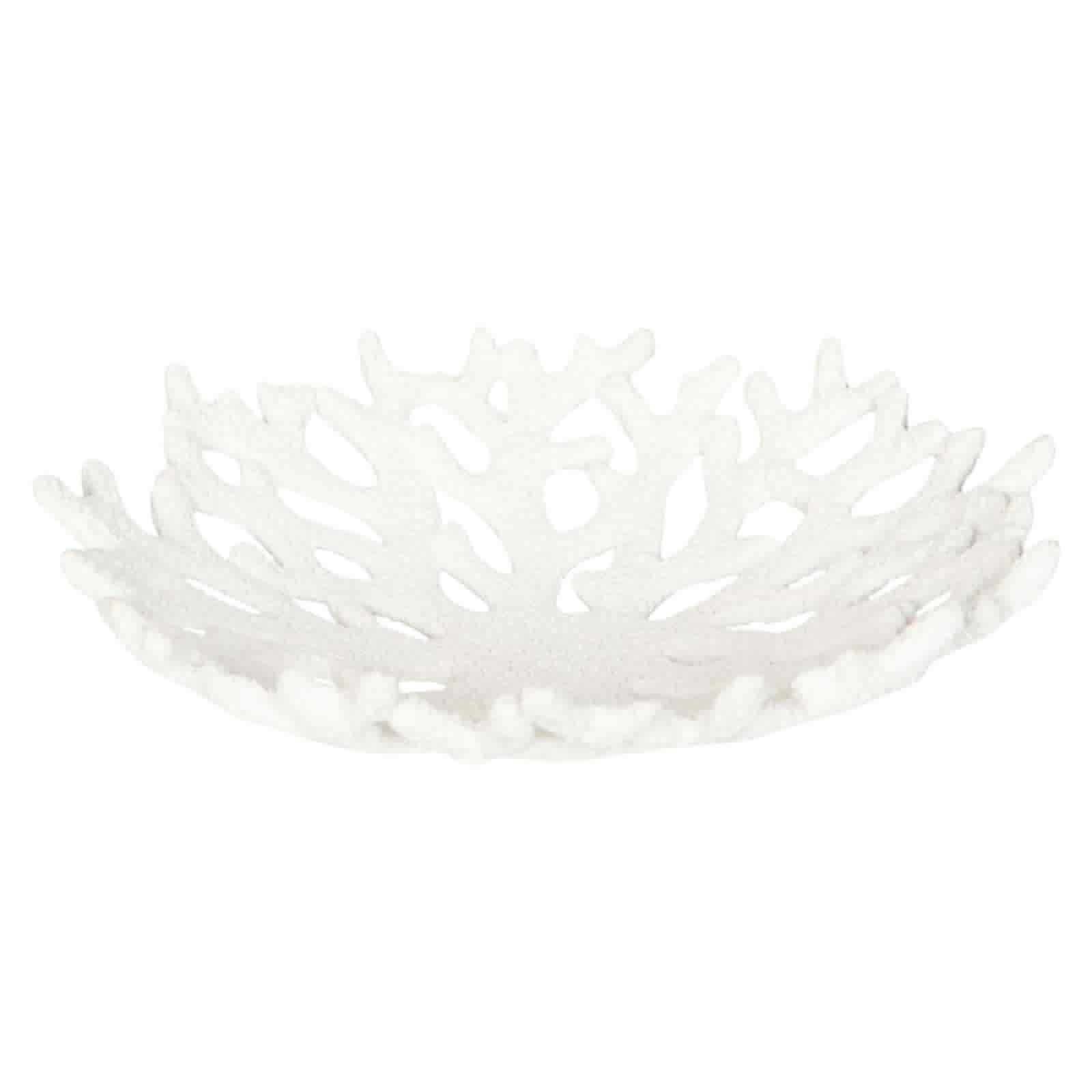 Vacker vit skål formad som en korall och fångar verkligen essensen av havet och korallrev. Dess intrikata mönster efterliknar de naturliga formationerna av koraller, med förgreningar och öppningar som ger den en öppen och luftig känsla. Den rena vita färgen förstärker dess marina tema genom att återspegla det ljusa solljuset som ofta filtreras genom klart havsvatten. Denna skål förmedlar känslan av varma sommardagar genom sin lätta och luftiga design. Den väcker tankar på solbelysta stränder och det lugna, rytmiska ljudet av vågor som slår mot kusten. Den påminner om det myllrande livet i korallreven, där färgglada fiskar och andra havslevande varelser rör sig i harmoni. Skålens form och struktur gör den till en perfekt dekoration för att föra in en bit av havet in i hemmet, och den kan också fungera som en påminnelse om de skönheter och rikedomar som finns under havsytan.. Material: Poly. Storlek:Ø24x6cm