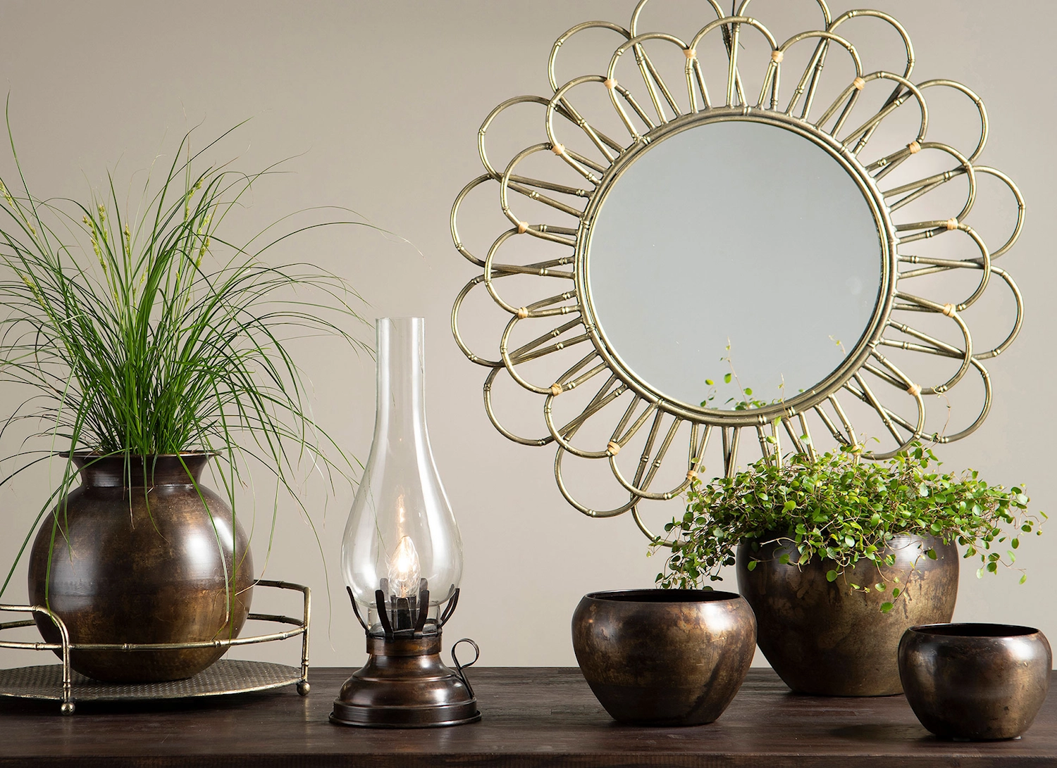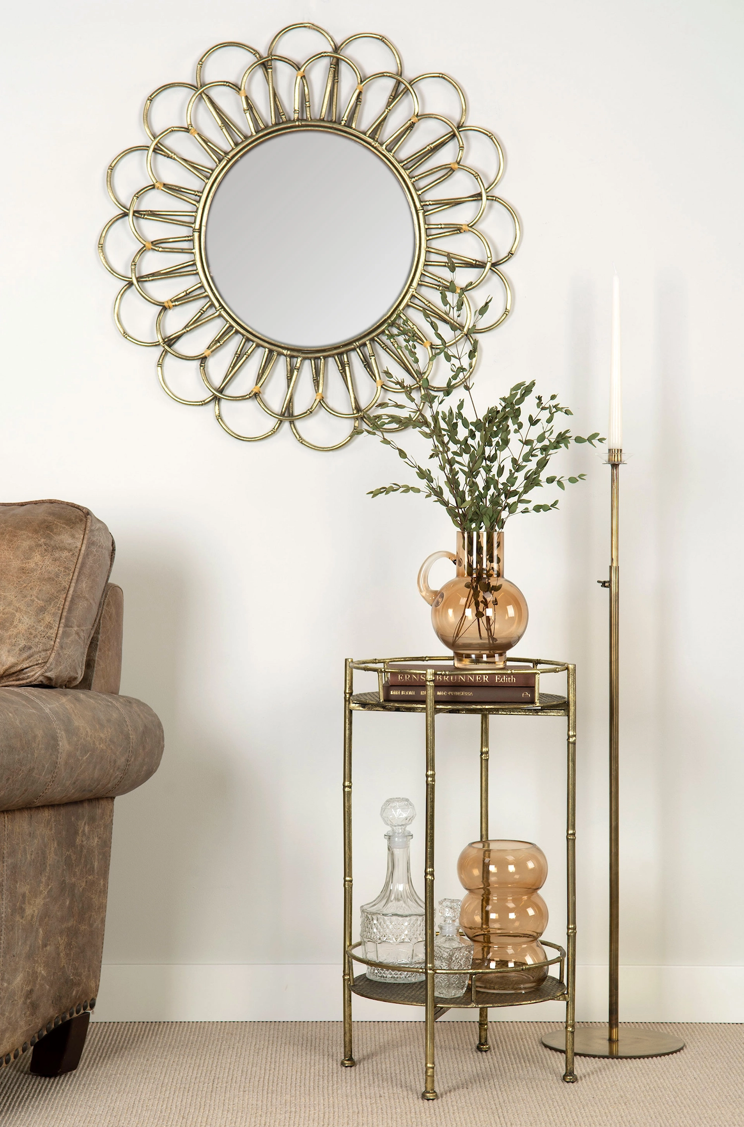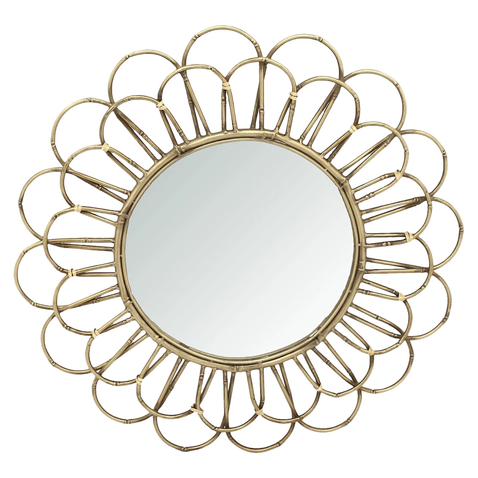 Dekorativ spegel med en rund form. Spegeln har en unik ram. Ramen består av flera böjda bågar som bildar en blomliknande struktur runt spegeln. Den är gjord av bambu och har en guldig ton. Denna design ger spegeln ett elegant och stilfullt utseende, vilket kan passa bra som dekoration i olika typer av interiörer, särskilt de med en vintage eller modern stil. Perfekt som ett dekorativt statement i hallen, vardagsrummet eller sovrummet. Den reflekterande ytan förstorar visuellt rummet samtidigt som ramen i bambu ger en varm och lyxig känsla. En riktig blickfångare som lyfter hela inredningen! Diameter: 70 cm Material: Bambu & spegelglas