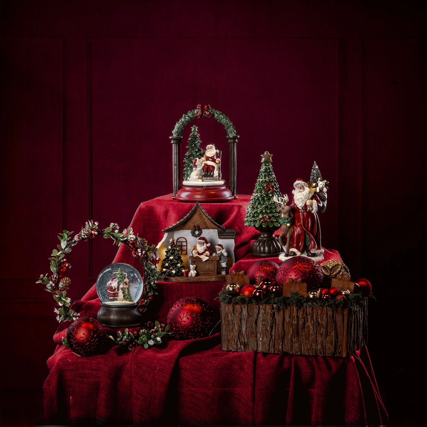 Julig speldosa som består av en figur av tomten som sitter bredvid en julgran. Tomten bär den traditionella röda dräkten med vitt skägg. En vit hund sitter vid hans fötter och tittar upp på honom. Julgranen är dekorerad med små röda bär och en stjärna på toppen. Tomten och granen är inramad av en båge med gröna grenar och röda bär samt en röd rosett på toppen. Bågen stöds av två mörka pelare och hela installationen står på en röd bas Perfekt inredning eller en underbar julklapp som kommer att charma hela familjen. Storlek:16x14x23cm Material: Poly