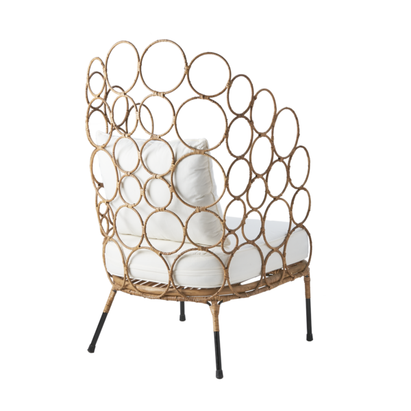 Den här bilden visar en karmstol i rotting med en unik och dekorativ design. Stolen har en hög rygg och sidor som består av stora, sammanflätade cirklar av rotting. Dessa cirklar skapar en öppen och luftig känsla. Sitsen och ryggstödet är klädda med vita dynor som ger komfort och en kontrast till den naturliga rottingfärgen. Stolen står på ben av metall, vilket ger en modern touch till den annars naturliga estetiken. Denna typ av stol kan passa bra både inomhus och i ett uterum, tack vare sin stilrena och konstnärliga design.Patineras av väder och vind, ej behandlade för att var ute i fukt och regn. Förvara under skydd eller inomhus vid fuktigt väder. Material: Metall, rotting. Storlek:W70xD70xH48/120 cm