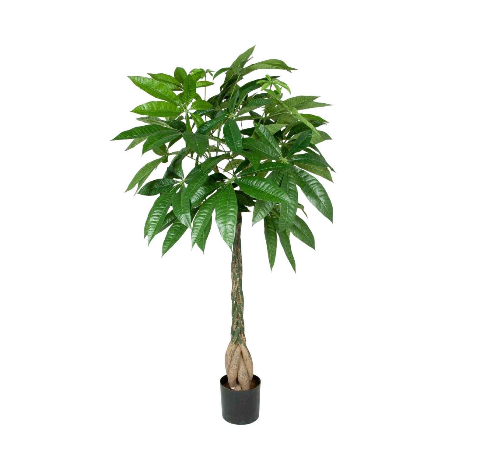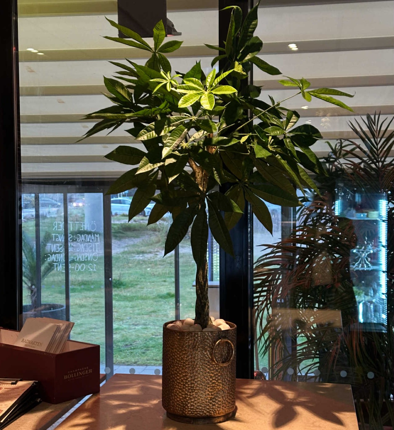 Denna eleganta konstgjorda Strandkastanj, även kallad Pachira, är en frodig och dekorativ växt med en karaktäristisk flätad stam som ger ett exklusivt och modernt uttryck. Växtens täta krona består av vackra, djupgröna blad tillverkade i UV-beständigt tyg. Detta gör att bladen behåller sin färg och lyster även vid exponering för solljus under lång tid. De tål dessutom vatten, vilket gör växten både hållbar och lättskött. Strandkastanjen är ett perfekt inslag för att skapa en levande och stilren miljö i Barer och restauranger • Receptioner och kontor • Butiker och offentliga miljöer Med sitt naturliga utseende och sin stabila kvalitet är detta en växt som höjer atmosfären – utan behov av skötsel.