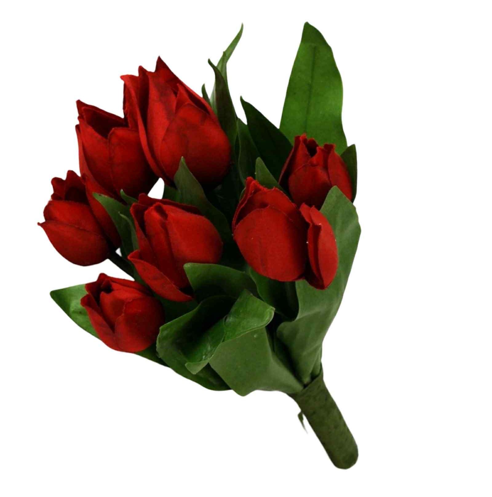 En liten, vacker och naturtrogen tulpanbukett i intensivt blodröd färg. Buketten är färdigbunden och enkel att placera direkt i en vas för att skapa ett elegant och romantiskt uttryck. De fylliga blommorna och de gröna bladen ger ett levande och maffigt intryck, och tillsammans med flera buketter förstärks volymen ytterligare – perfekt när du vill skapa en riktigt iögonfallande dekoration. Ett tidlöst och stämningsfullt inslag som passar året runt i både hemmet och offentliga miljöer. Tips: Kombinera två eller fler buketter för en ännu mer lyxig och dramatisk känsla.