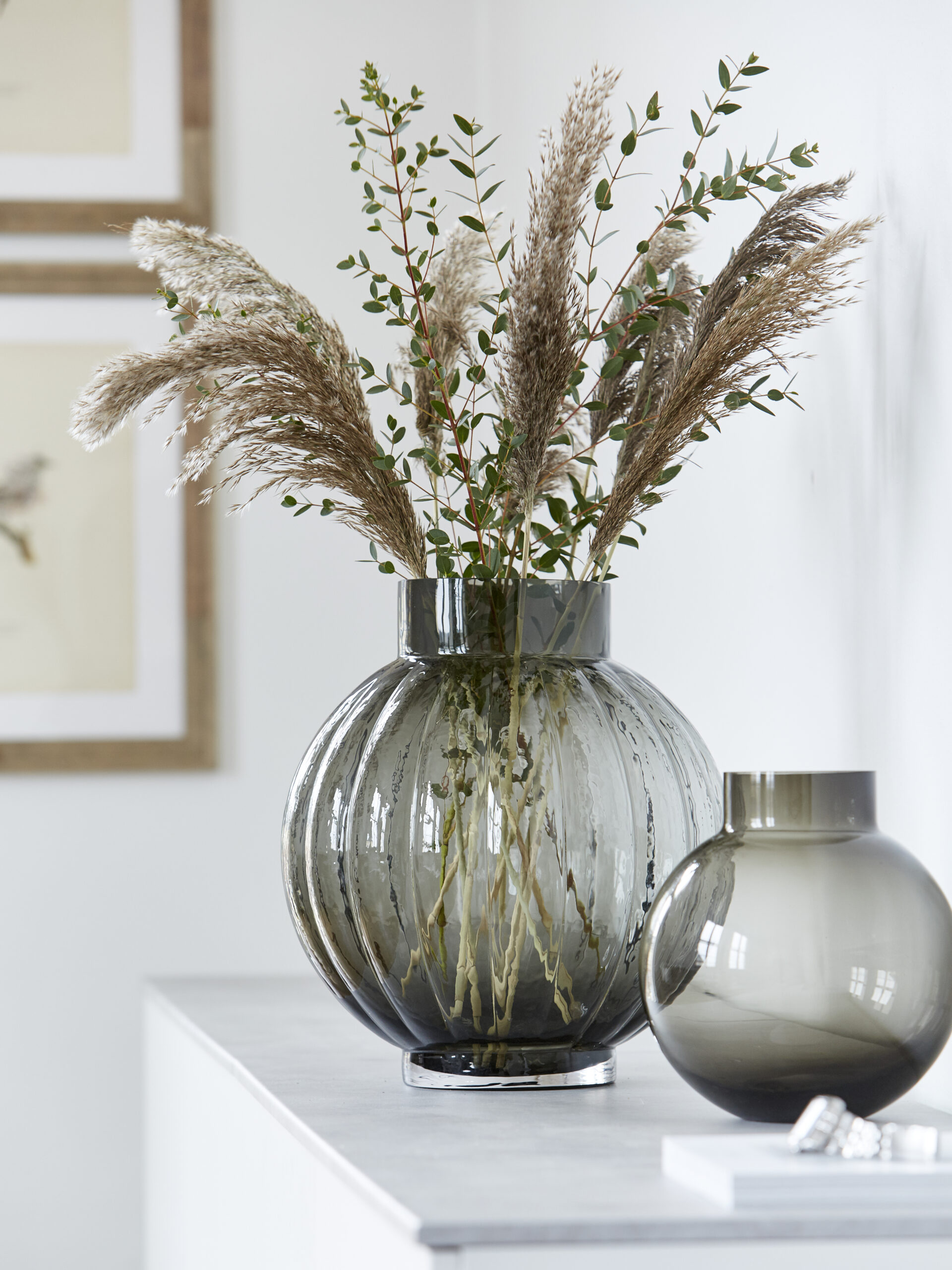 Trendig snygg glasvas i rökig färg. Vas till blommor och konstgjorda snittblommor. Pampasgräs och annat bladverk. En snygg vas betyder mycket och kan lyfta vilken bukett som helst. Så fint att mixa och matcha olika snittblommor i vas Höjd 35 cm Diameter 32 cm Diameterø 13,5cm. Material glas.
