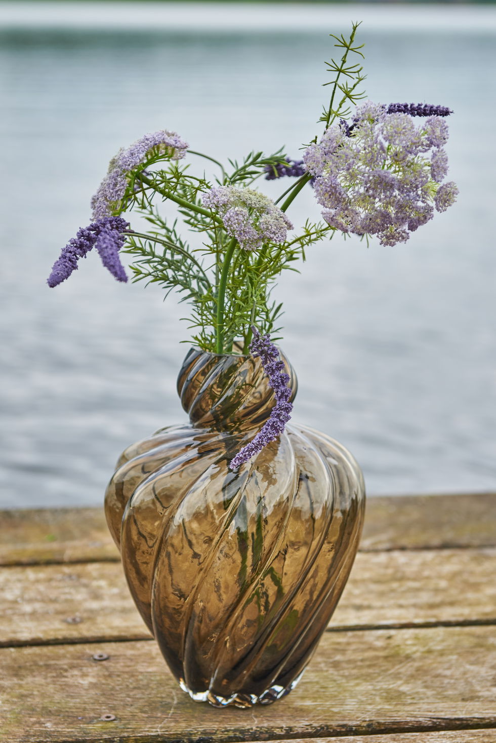 Denna glasvas har en imponerande och konstnärlig design som kombinerar både funktion och estetik. Den spiralformade strukturen ger en känsla av rörelse, vilket gör den till en iögonfallande dekoration. Den brunsvarta färgen på glaset kan komplettera olika inredningsstilar, från modern till klassisk, och ger en varm och jordnära känsla till rummet. Designen med den breda basen som smalnar av mot en något smalare öppning gör att vasen kan hålla en mängd olika buketter, från stora blomsterarrangemang till enkla, eleganta kvistar. Den är tillräckligt robust för att stå stabilt, samtidigt som den har en lätt och luftig känsla tack vare glasets transparens. Denna vas kan placeras snyggt på ett matbord, en mantelpiece, eller en sidobord för att förhöja inredningen och skapa en fokuspunkt. Dess tidlösa design gör den till ett utmärkt val för både formella och informella miljöer. Material: glas Storlek: Ø38xH35 cm