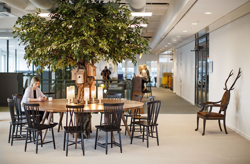 På AMF Fastigheters kontor på Regeringsgatan i Stockholm har ett stort dekorativt fikusträd installerats som en central mötespunkt i kontorsmiljön. Trädet är uppbyggt av äkta vinstammar som formar en naturlig och skulptural stamkonstruktion, kombinerad med en fyllig krona av konstgjorda fikusblad i varierande gröna nyanser för ett naturtroget uttryck. Den breda trädkronan skapar en ombonad atmosfär över sittgruppen och fungerar som ett naturligt samlingsrum i lokalen. Installationens organiska form mjukar upp den moderna kontorsmiljön och tillför en grön, levande känsla utan behov av underhåll. Som en unik detalj är fågelholkar monterade på trädets stam, vilka fungerar som diskreta laddstationer för mobiltelefoner. På så sätt kombineras estetik, funktion och innovation i en och samma installation. Projektet är ett exempel på hur konstgjorda träd kan användas för att skapa gröna, inspirerande och funktionella mötesplatser i moderna arbetsmiljöer.