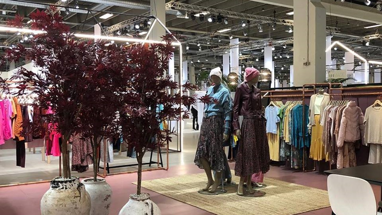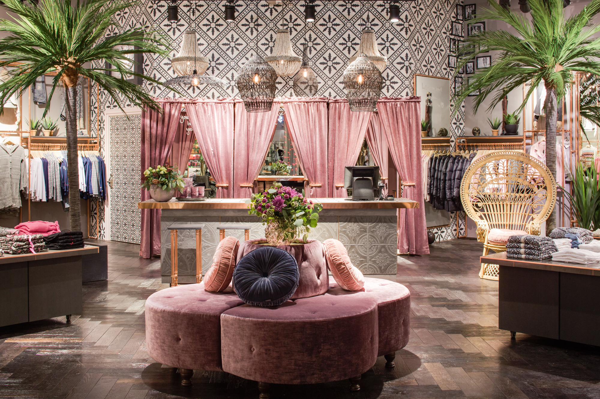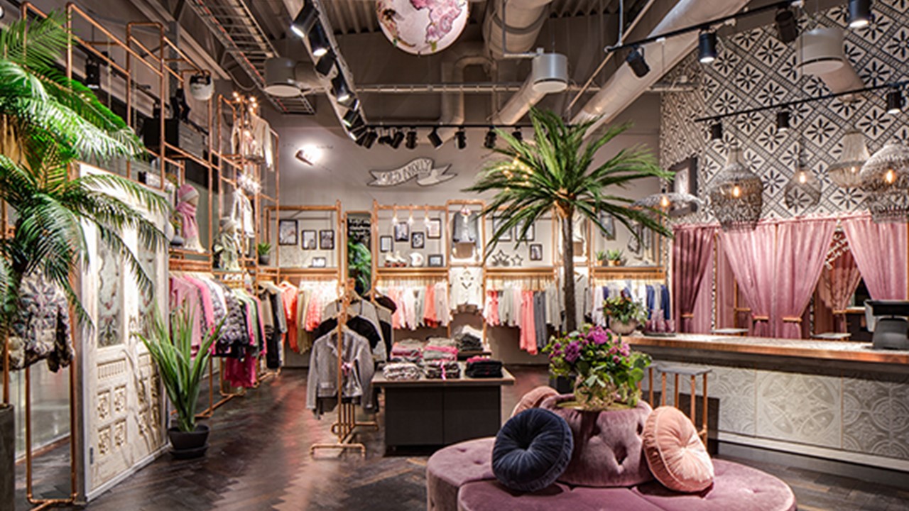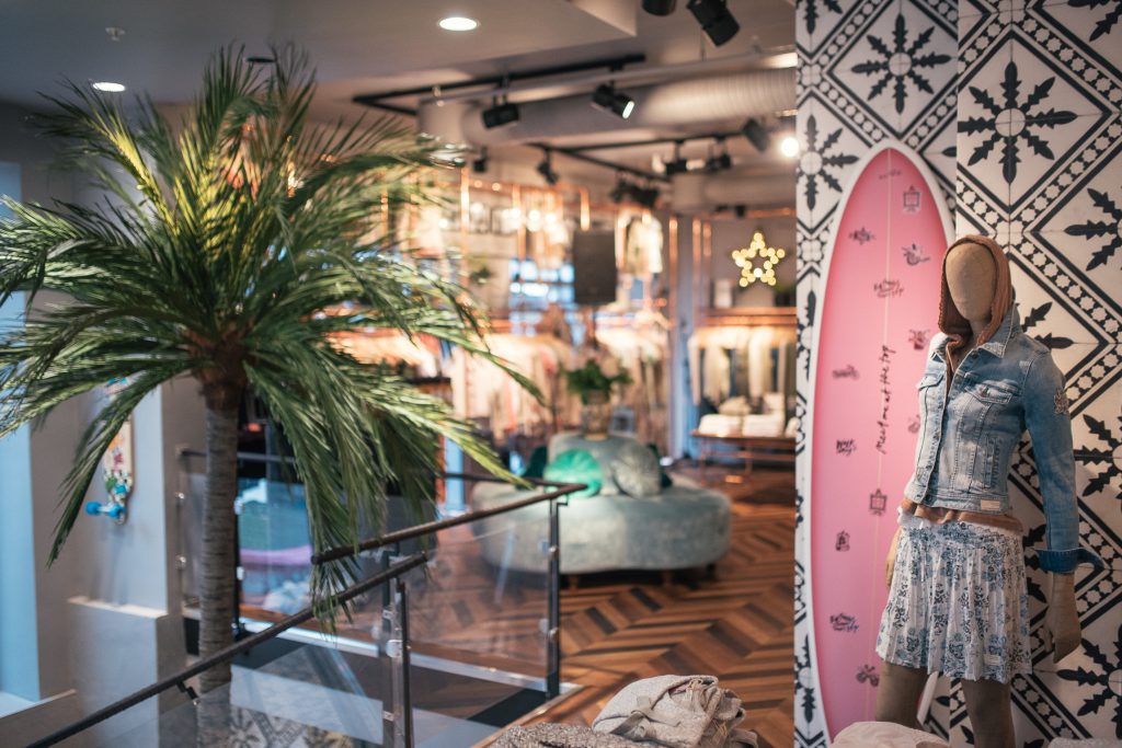 De gröna inslagen ramar in butikens mjuka textilier, mönstrade ytor och varma färgskala och bidrar till en harmonisk helhet där natur och mode möts. Växterna tillför höjd, rymd och struktur samtidigt som de skapar en varm och inbjudande atmosfär för kunderna.